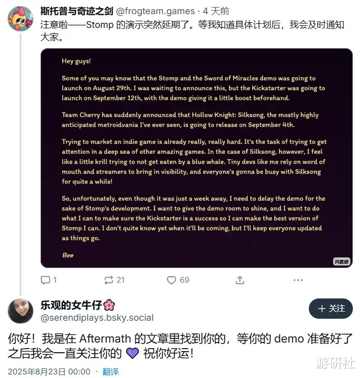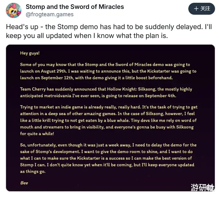 就连一些尚未进入发售阶段的游戏,也因为《丝之歌》的突然到来显得大为苦恼:《Stomp and the Sword of Miracles》原本计划在8月底开启众筹、9月初发布试玩Demo,如今因为《丝之歌》发售,宣布了推迟众筹时间。