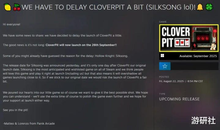 除了银河恶魔城游戏,也有一些其他类型的游戏选择了躲避《丝之歌》的锋芒:“小丑牌Like”游戏《CloverPit》,原本计划在9月3日发售,如今推迟到了9月26日。