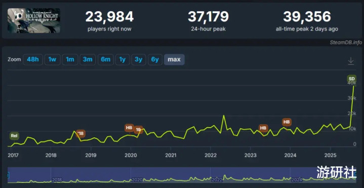 这个消息点燃了全球玩家的热情,《空洞骑士》时隔多年再次刷新历史最高同时在线人数纪录,当日峰值人数来到了3.9万。