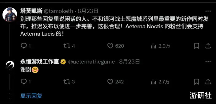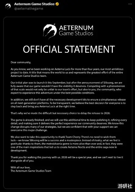 比如原计划9月发售的《Aeterna Lucis》,在《丝之歌》公布发售日当天,便在推特上发表了声明,宣布将一路推迟至2026年发售,部分原因是“为了避免受到《丝之歌》影响”。